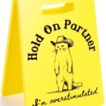 Funny Cowboy Cat Meme Desk Sign “Hold On Partner I’m Overstimulated” – Hilarious Office Decor, Sarcastic Gag Gifts for Coworkers, Introverts, Women, Men – Funny Cubicle Accessories