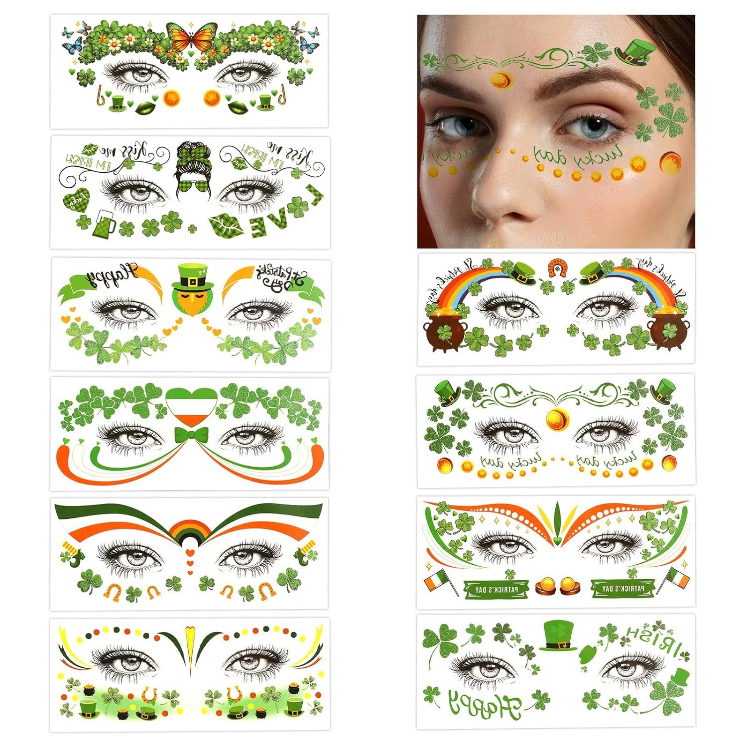 10 Sheets St Patrick’s Day Temporary Tattoos, Lucky Shamrock Irish Painted Face Sticker Clover Tattoo Saint Patricks Day Accessories Theme Party Favors for Body Eyes Face Art Makeup Decoration