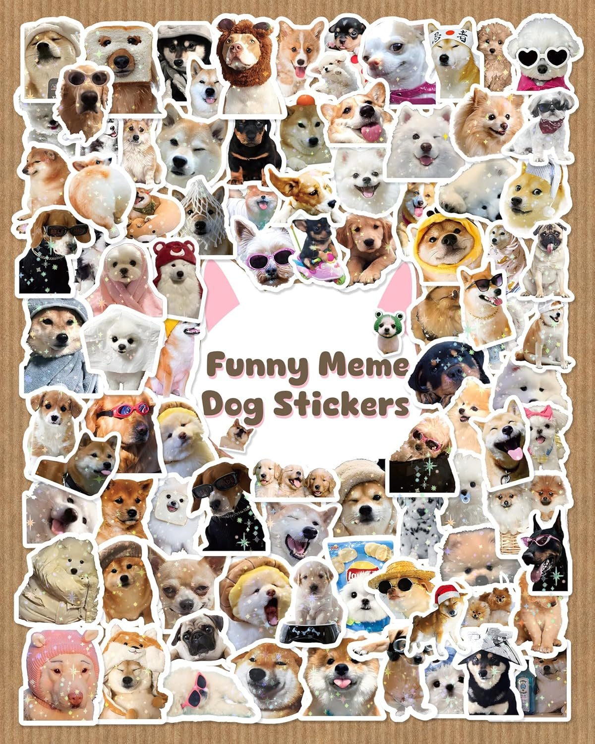 Variety Pack: Get 100 pieces of funny dog meme stickers with holographic sparkly designs featuring cute puppies and pets.