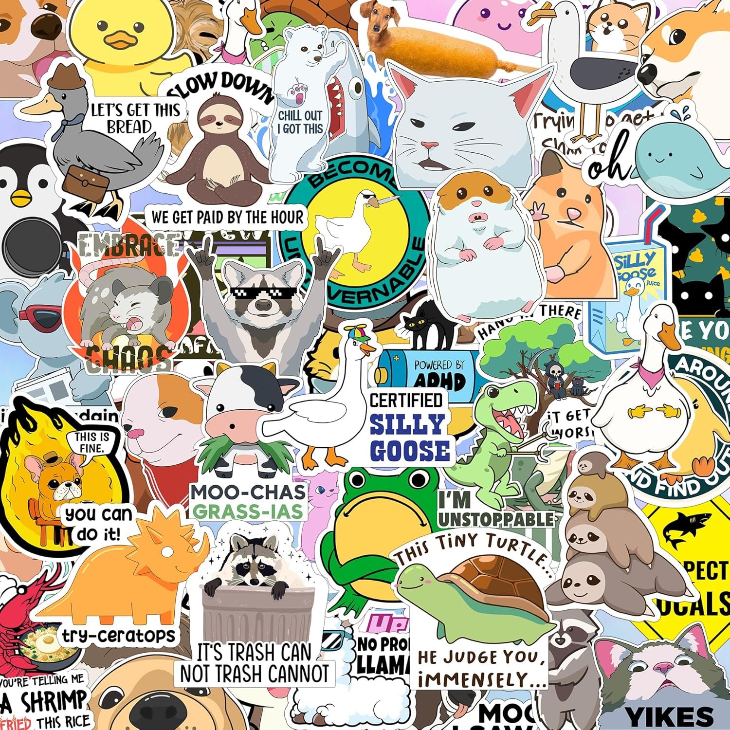 🐱🦰 120pc Funny Animal Meme Stickers PLENTY OF STICKERS: Add humor with this pack of 120 Funny animal-themed stickers! Perfect for laptops, water bottles, and more. These stickers feature the funniest internet memes and clever quotes. Brighten your workspace or bring smiles with these quirky designs. Durable & Waterproof: Made from high-quality vinyl, each sticker measures 2-3 inches. They resist wear, weather, and time. Ideal for indoor and outdoor use, whether it’s rain, snow, or sunlight. These stickers are built to last. Easy Application: Strong adhesive ensures easy application and removal without sticky residue. The glossy laminate finish adds a sleek shine. Add joy or bring laughter with these durable stickers. Choose your favorites today!