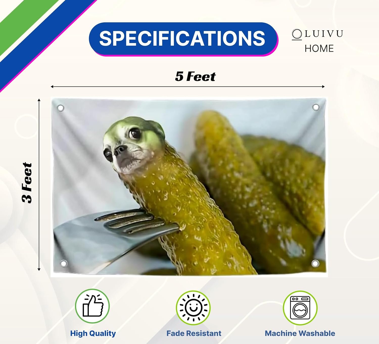 Imported 100% polyester flag with large size 3×5 feet/90x150cm. Meme flags for dorm room decor boys and girls, tapestry funny with the image of a cucumber dog, wall poster for college or home decor.
