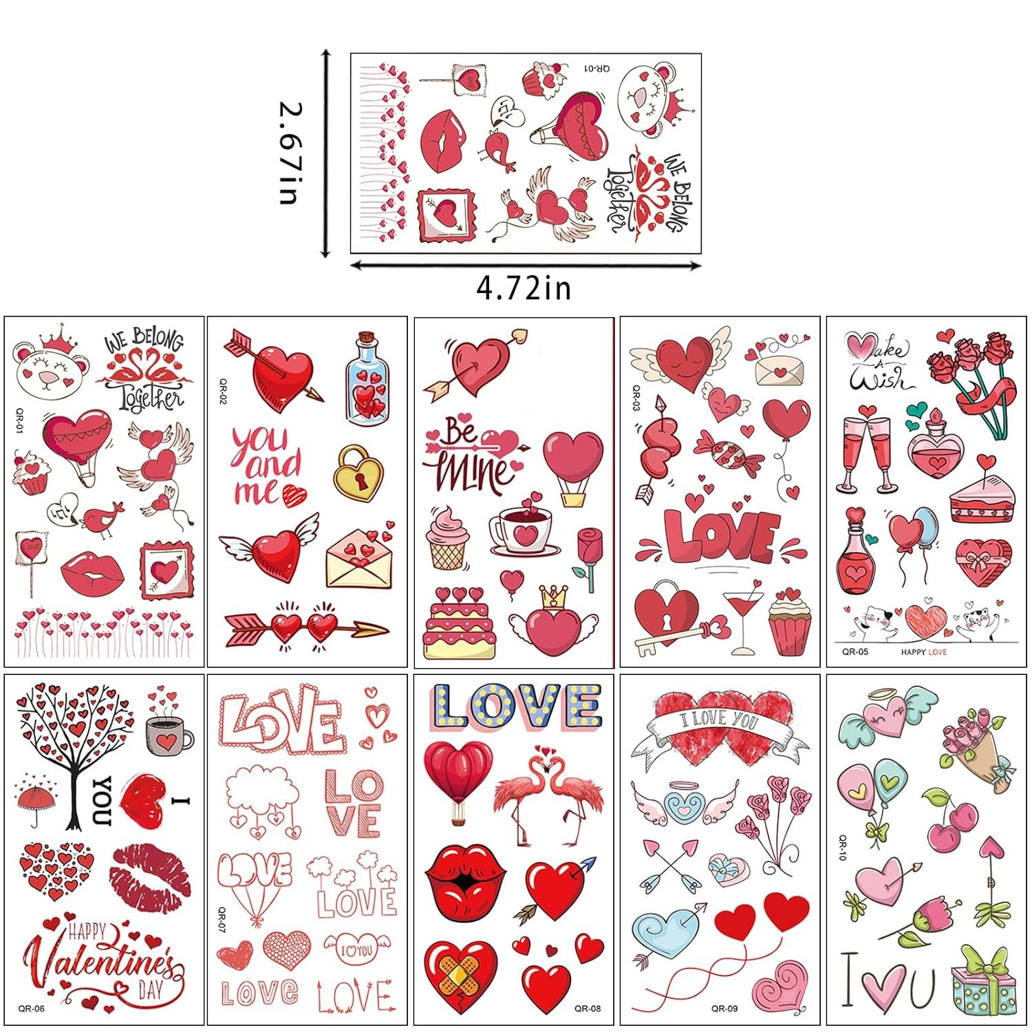 1.Package contents: you will receive 10 sheets of Valentine’s Day tattoos, totaling 85 pieces in 85 designs, sufficient to meet your use needs for Valentine’s Day party games; and the size of each sheet is 4.72×2.67in