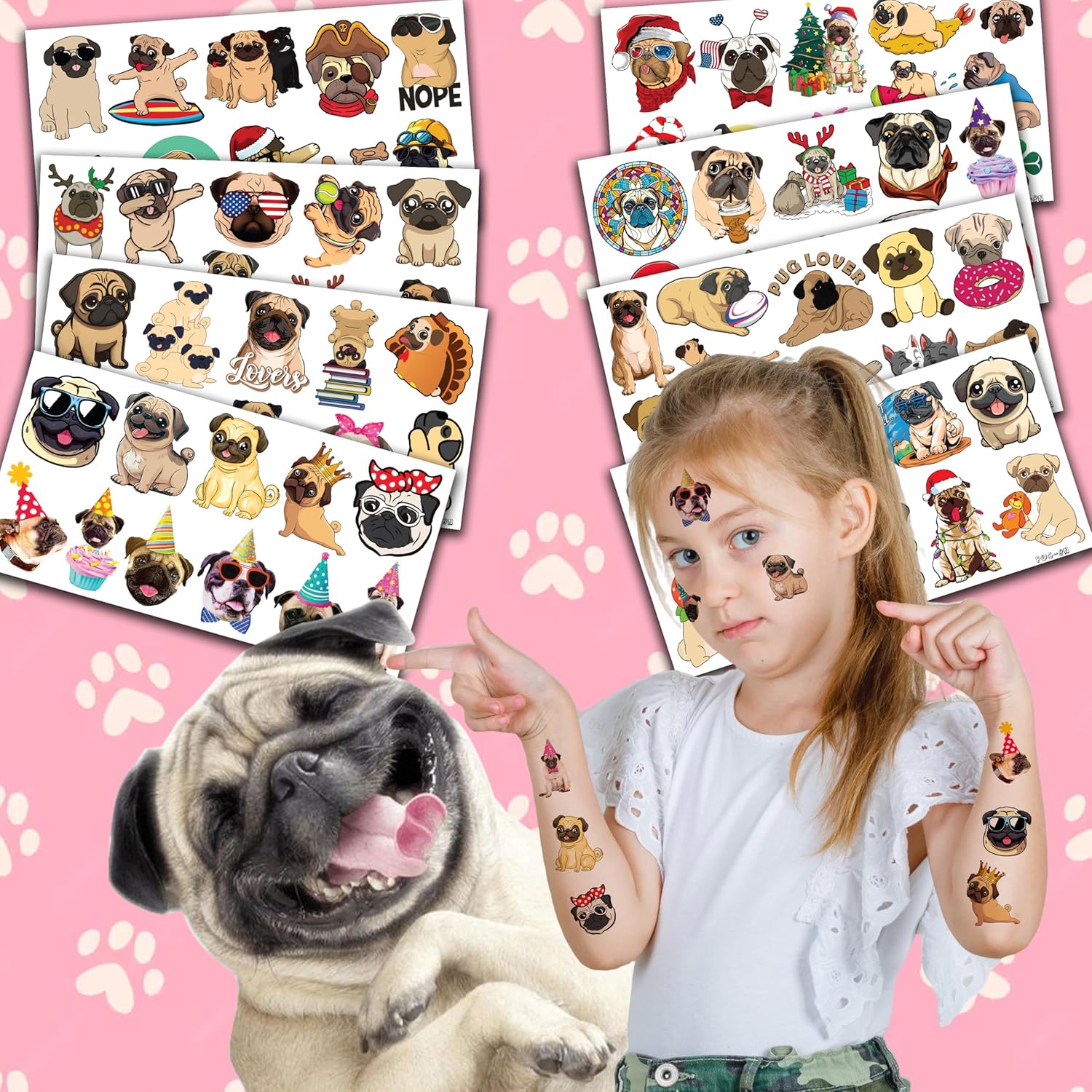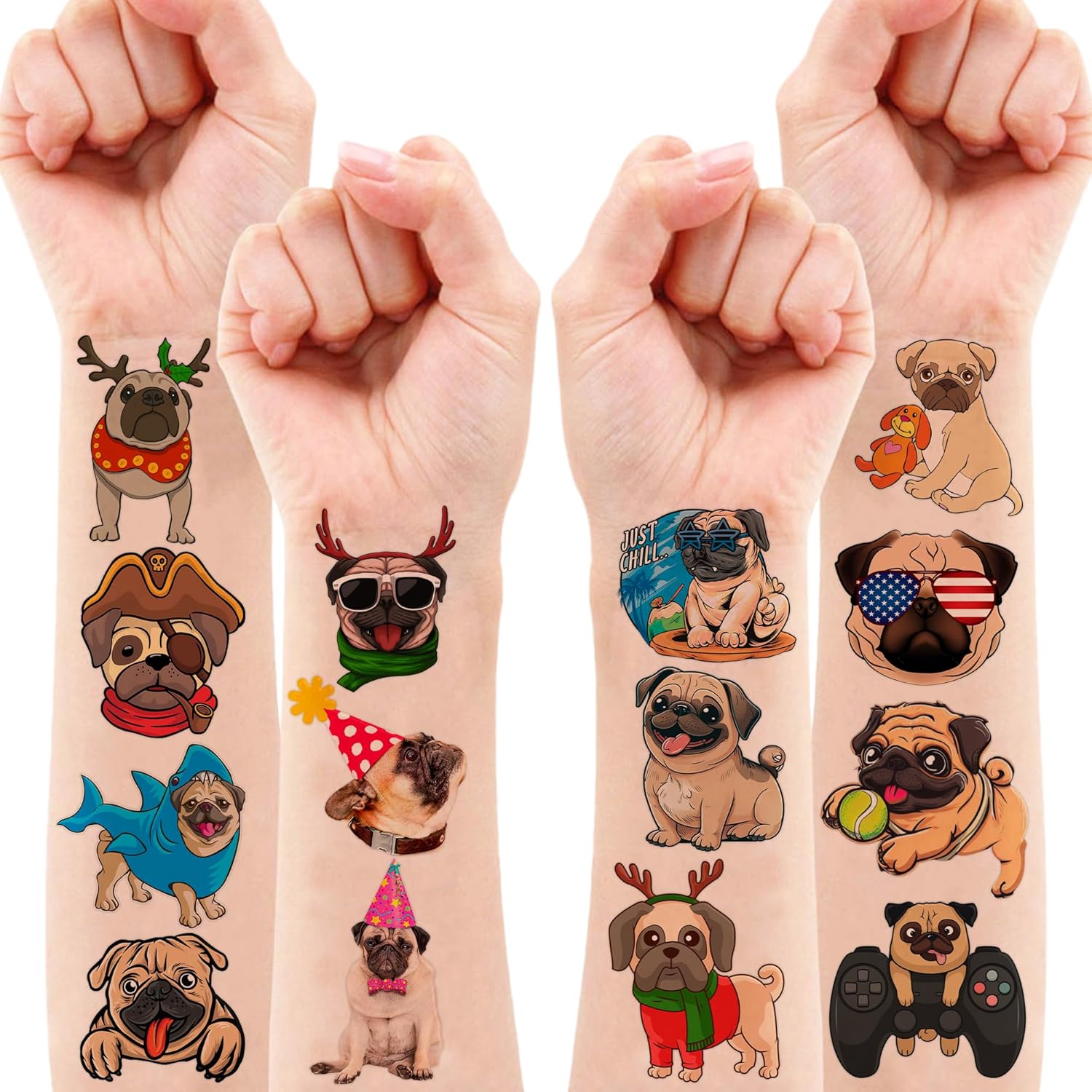 🐕CUTE PUG PARTY DECORATIONS: Hey there! You’ll be receiving an awesome set of 8 sheets with 86 PUG tattoos pieces. Isn’t that amazing? You’ll have plenty to use daily, replace, or even share with your friends and family. So get ready to show off your unique style and have some fun with these cool tattoos! 🐶PUG BIRTHDAY PARTY DECORATIONS: PUG tattoos are great for any event, including casual get-togethers, National Dog Day, Santa Barbara Dog Day, dog parties, pet parties, dog fashion shows, and pug-themed birthday celebrations. Personalize the PUG birthday party to fit your party’s needs. ♻️SAFE AND HIGH QUALITY: We create temporary tattoos using high-quality, eco-friendly paper that is safe to use. Our tattoos are visually appealing and made with utmost care for our clients’ safety. 📌USAGE: Before removing the tattoo, it’s essential to take off the clear paper from the sheet. You can choose any covered surface like your arms, hands, face, or objects like a water bottle, purse, laptop, or phone case to apply the product. Wait 20 to 30 seconds, sprinkle a few drops of water on the tattoo, and remove the backing paper. You’ll have a gorgeous, velvety tattoo that can be easily removed with baby oil, soap, or water. Go ahead and enjoy your stunning new look! 💌CUSTOMER SERVICE: If you have sensitive skin, we advise against using this product. In case of any symptoms, please stop using it immediately. Our team is always here to help and make sure you have a positive shopping experience. Please do not hesitate to contact us for assistance.