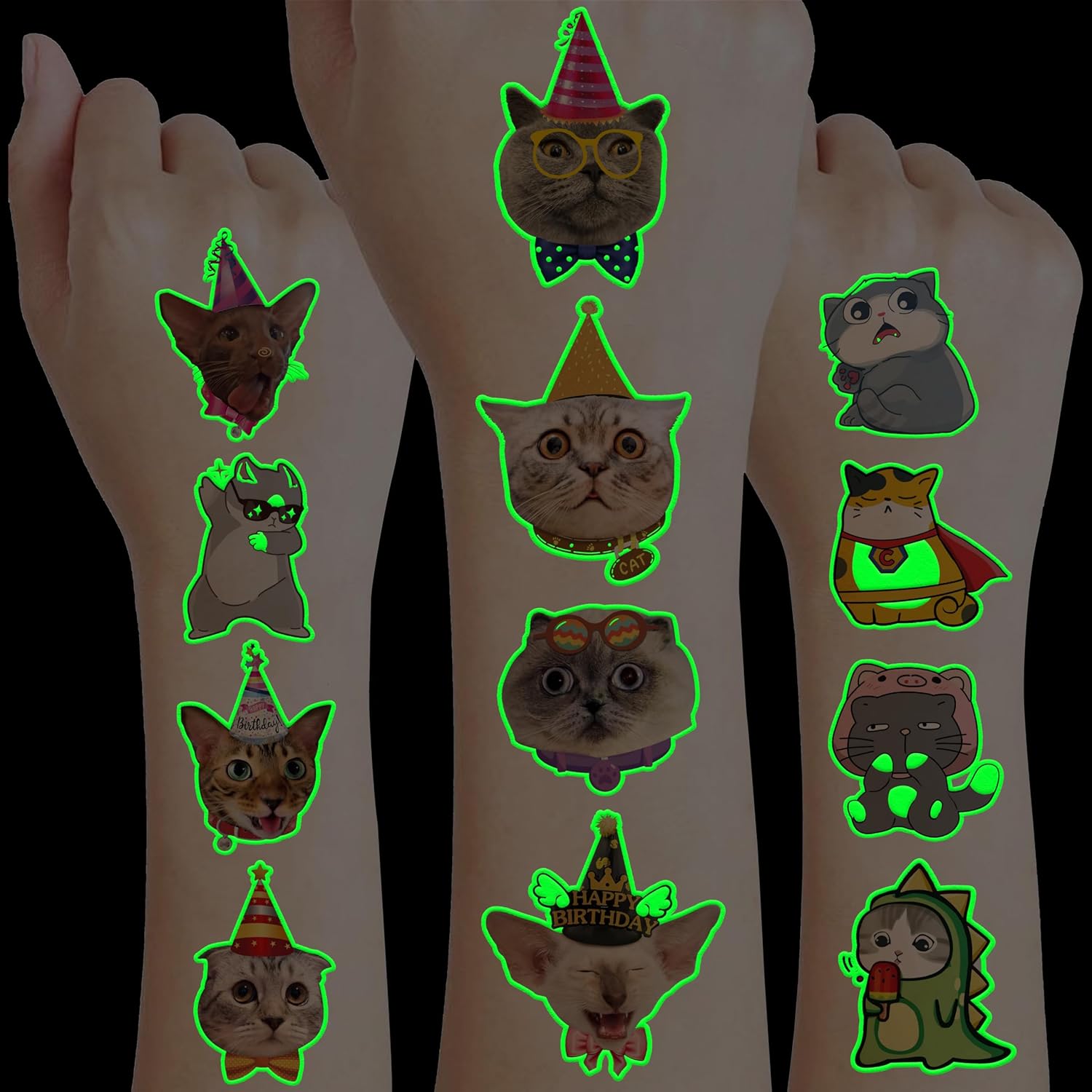 Perfect for Cute Cat Cats Pet Animal Paw Birthday Party Decorations Supplies & Events: Great for themed parties, birthday activities, school rewards and other party events. These luminous tattoo stickers can be applied on arms, hands, face, neck, shoulders… to make you look cool and stand out at all kinds of parties. A popular hit with your kids. You can also apply them to smooth objects such as glass, laptops, paper, cups, bottles… to create a glowing party vibe.