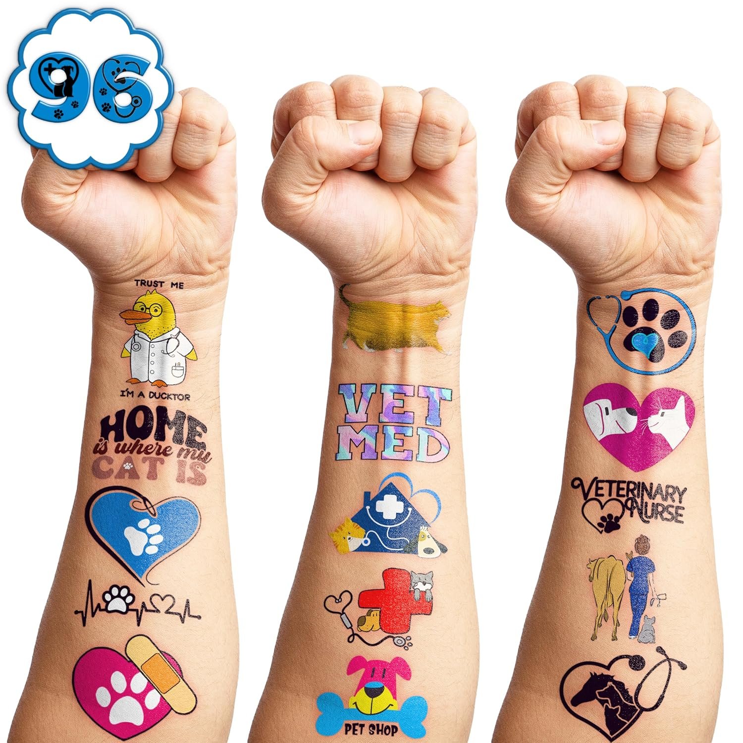 【Cute patterns】Funny Veterinary Vet Medicine Technician Vet Med Temporary tattoos stickers, features an assortment of themed characters, colors are bright, and designs are adorable, which are attractive to children.
