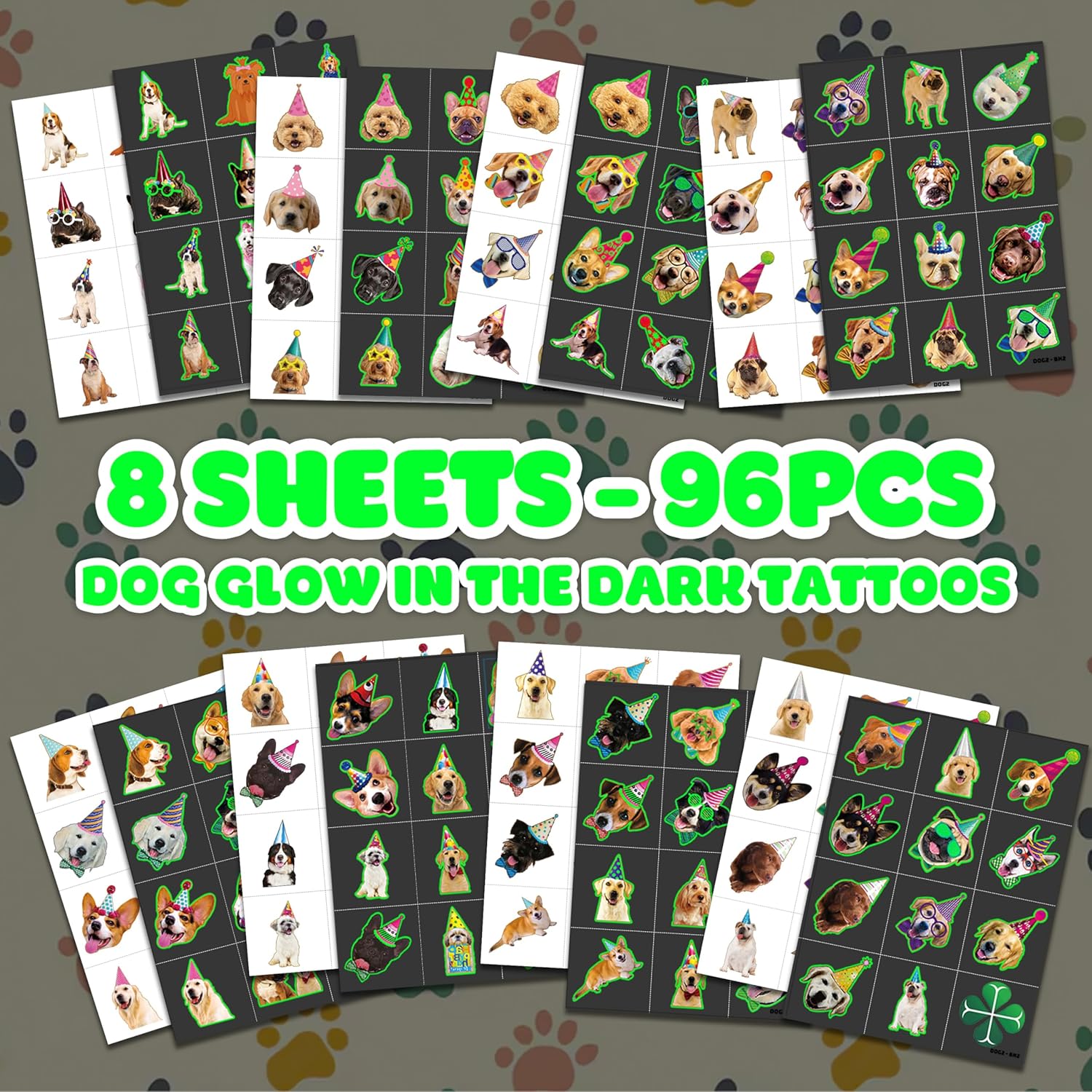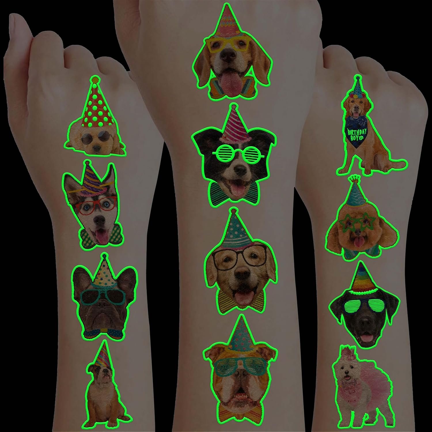 96PCS Dog Party Luminous Neon Temporary Tattoos Stickers for Kids | Waterproof & Skin-Safe | Cute Puppy Theme Glow in the Dark Birthday Supplies, Party Favors, Halloween Decorations (Glow in the dark)