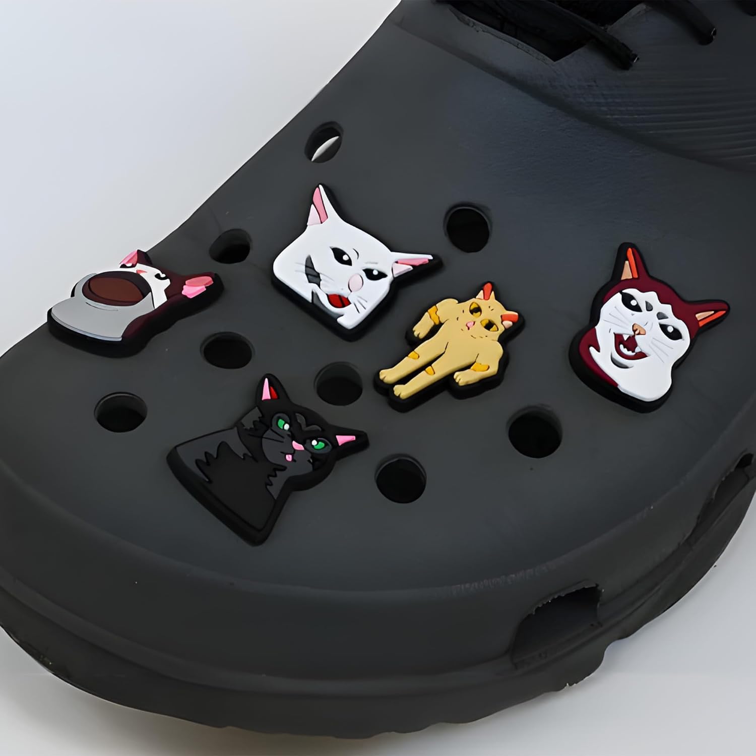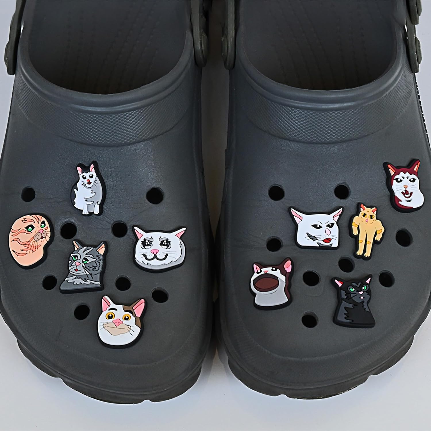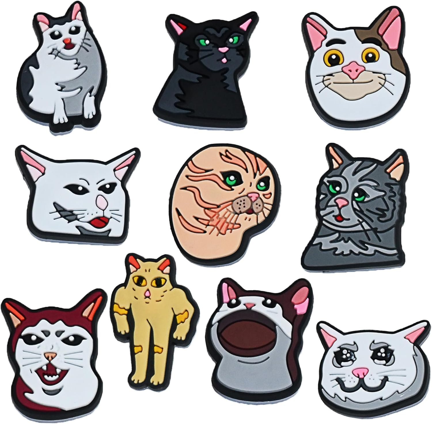 Add a touch of fun and personality to your shoes with our Cat Meme Charms! This pack includes 10 unique and cute unisex shoe charms that are perfect for women, men, teens, and kids. Made from high-quality durable materials, these charms are designed to fit perfectly into the holes of your clogs, providing a secure and stylish fit. Whether you’re looking to showcase your love for cats, add some humor to your footwear, or simply stand out with cool, 3D designs, our Cat Meme decoration are the perfect accessory. Ideal for gifts, personal use in summer, or as a fun addition to your sandals collection, these charms are a must-have for any croc enthusiast.