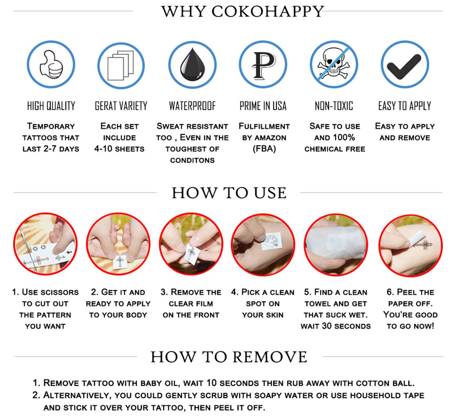 Waterproof: The tattoos are waterproof and can be used for swimming and showering