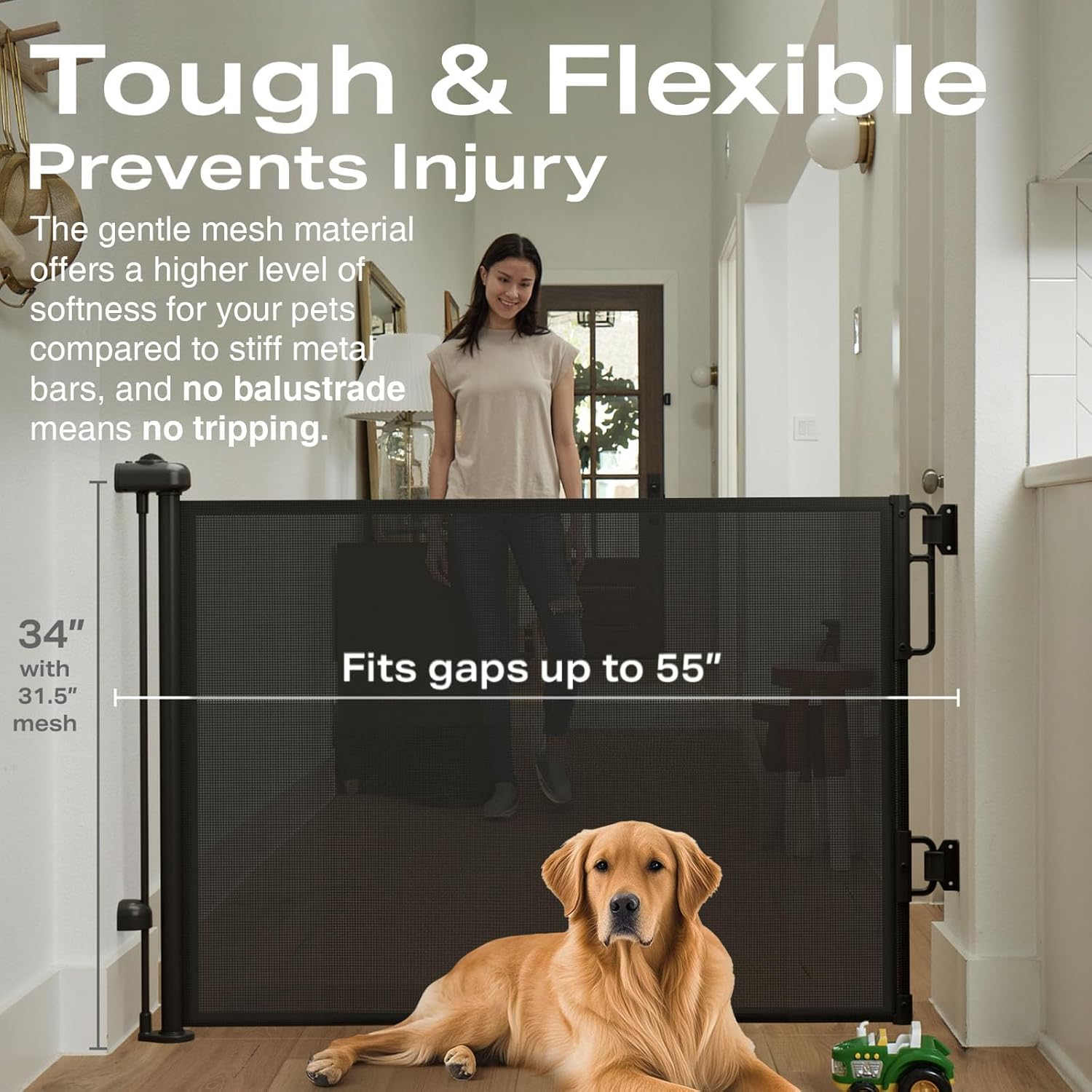 New Safety Locking: The knob at the top of the mesh gate ensures that the retractable pet gate is easy to use for adults and can be opened and closed with one hand, while curious little ones and pets will not be able to make any naughty bids for freedom