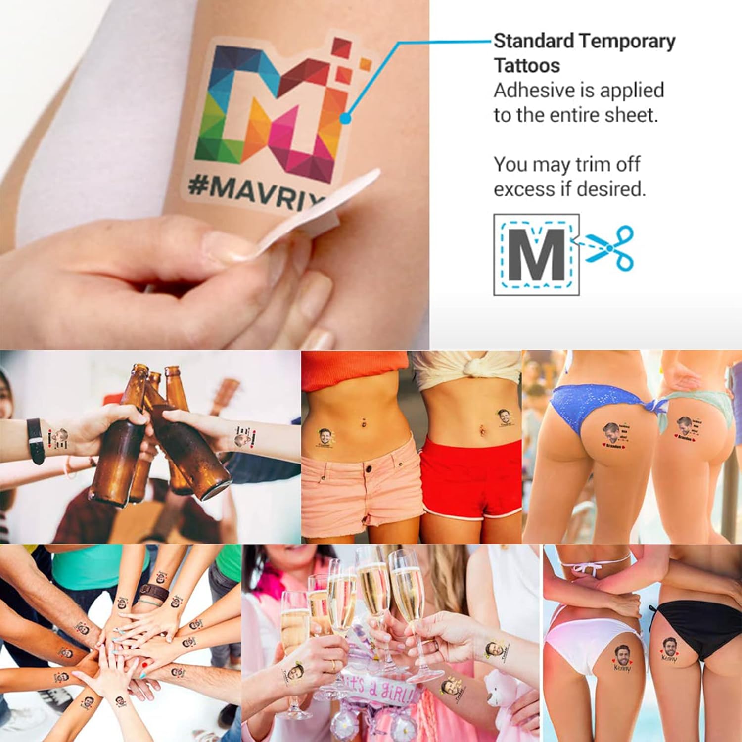 Creative & Fun Custom Temporary Tattoos – Depending on the style you select, please provide the required custom info or photo for your tattoos (name, text, age, etc.); Please upload the 1 high resolution photo and we’ll take care of cropping out their face ourselves; On applicable styles, we add the hat, crown, etc.