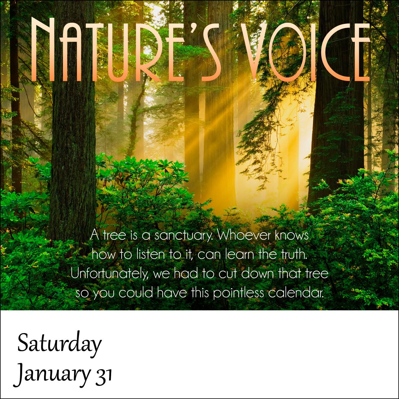 Are you tired of motivational messages telling you to strive for more? Why not lean into the beauty of doing less with the Demotivational Daily Calendar! Packed with hilariously uninspiring quotes, this calendar will help you find fresh excuses to put off responsibilities, ignore deadlines, and avoid spending quality time with your family. The gorgeous photos will demotivate you even more, as you can sit and stare at them for hours, wishing you were somewhere else.