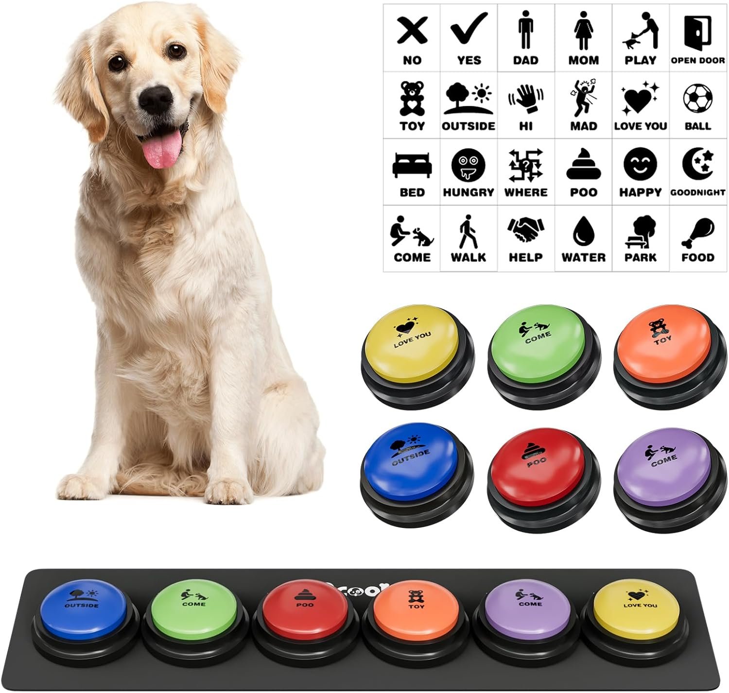 【Pet Starter Set】Dog speaking buttons set contains 6 buttons for your dog to press to communicate, 1 dog button mat, 24 scene stickers, the pet button set comes in 6 different bright colours including dark blue, red, yellow, orange, green and purple, enough for your daily use and can be changed and shared when needed, making it the ideal pet communication talk toy.