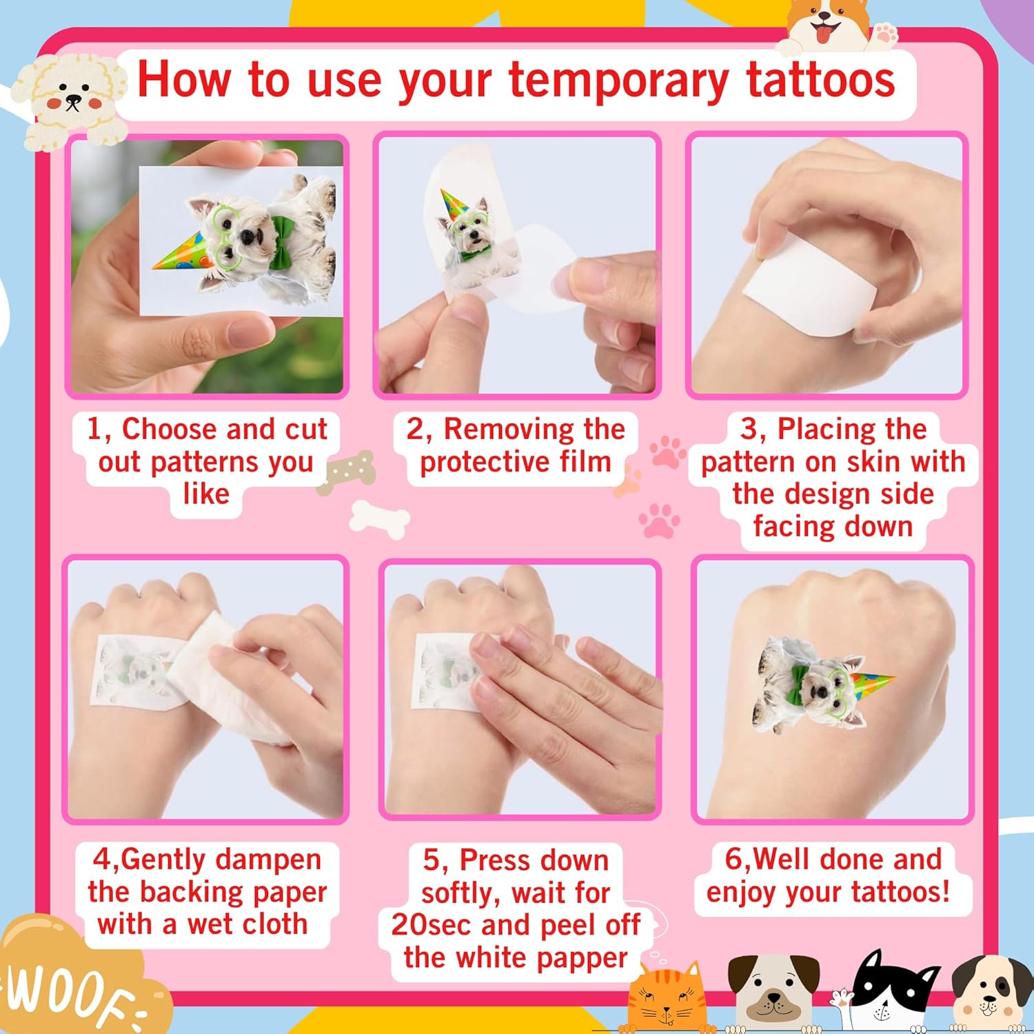 Endless Fun with Dog Temporary Tattoos and Stickers: Our collection includes a variety of dog tattoos for kids that can be used for crafts or as extra dog-themed party favors. Together, they provide an engaging experience that fosters creativity and imagination among young guests.