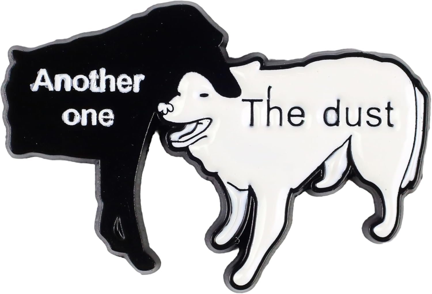 Make a bold statement with this unique enamel pin featuring a playful black and white design. This artistic piece showcases a clever visual message with ‘Another one’ and ‘The dust’ text arranged around a charming dog silhouette. Measuring approximately 1.5 inches in width and crafted from durable enamel, this lightweight pin weighs just 0.5 ounces, making it great for everyday wear. The vintage-style design features raised lettering and dimensional elements that create engaging visual depth. Ideal for personalizing jackets, bags, backpacks, or lapels, this pin comes with a secure metal backing to ensure it stays firmly in place. The striking contrast between the black and white sections makes this piece stand out while maintaining a versatile aesthetic that complements any style. The pin’s compact size and professional finish make it an excellent choice for collectors and fashion enthusiasts alike. Each pin is carefully crafted with attention to detail, ensuring the design remains crisp and clear through regular wear.