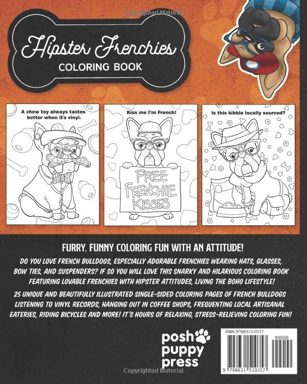 Do you love French Bulldogs, Especially adorable Frenchies wearing hats, glasses, bow ties, and suspenders? If so you will love this snarky and hilarious coloring book featuring lovable Frenchies with hipster attitudes, living the Boho lifestyle!25 unique and beautifully illustrated single-sided coloring pages of French Bulldogs listening to vinyl records, hanging out in coffee shops, frequenting local artisanal eateries, riding bicycles and more! It’s hours of relaxing, stress-relieving coloring fun!