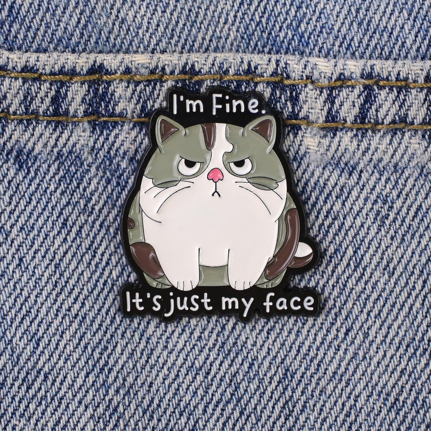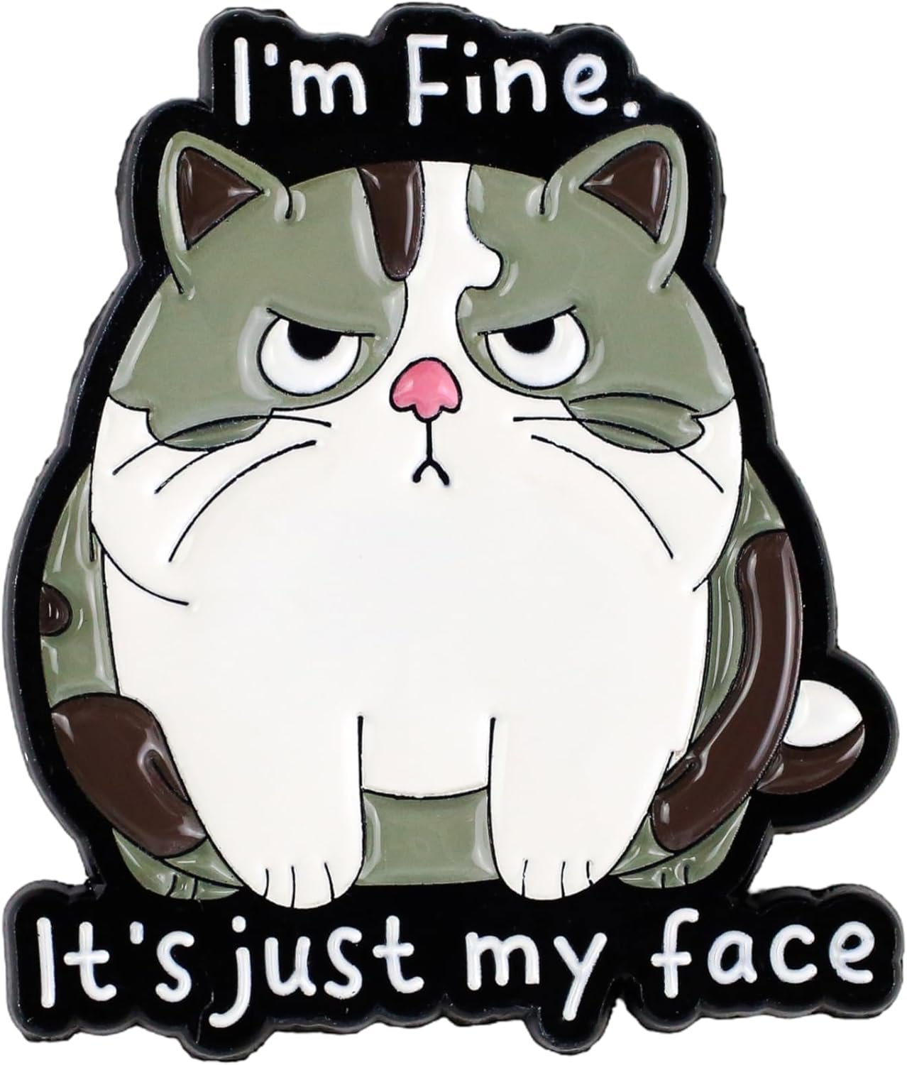Express your mood with this adorably angry cat enamel pin featuring the humorous phrase ‘I’m Fine, It’s Just My Face.’ This charming accessory captures that perpetually unimpressed feline expression we all know and love. The pin showcases a detailed design of a grey and white cat with expressive eyes and a distinctively unamused expression, set against a bold black background with crisp white lettering. Crafted with enamel on durable metal, this pin makes a addition to your jacket lapel, backpack, or collection board. The pin comes with a secure butterfly clutch backing to ensure it stays firmly in place throughout your day. Measuring approximately 1.5 inches in width and length, this lightweight pin weighs just 0.5 ounces, making it comfortable for everyday wear. Whether you’re a cat lover or simply appreciate sarcastic humor, this pin is sure to spark conversations and draw knowing smiles from fellow feline enthusiasts.