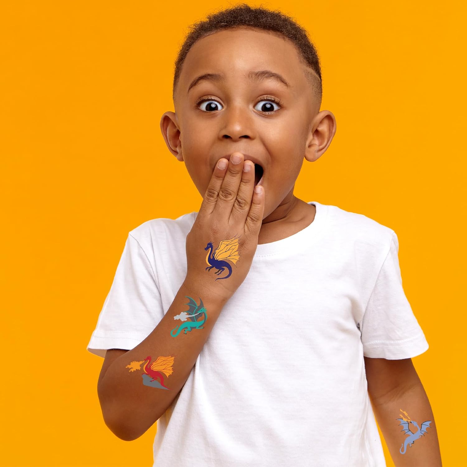 Transform playtime into a magical adventure with these stunning dragon temporary tattoos! Each pack includes 36 vibrant tattoos featuring 12 different mystical dragon designs, from fire-breathing wonders to majestic winged creatures. The tattoos are individually printed on 2″ x 2″ cards, making them perfect for parties, goodie bags, or trading with friends. Each design showcases incredible detail and rich colors that kids will love showing off. These temporary tattoos are easy to apply and remove, offering hours of imaginative play. The convenient individual cards make distribution a breeze at birthday parties, school events, or other celebrations. Whether your little one dreams of dragons or just loves fantastic creatures, these temporary tattoos will spark their imagination and bring their adventures to life. Perfect for dragon enthusiasts of all ages, these high-quality temporary tattoos make excellent party favors, rewards, or just-because treats. Transform playtime into a magical experience with these delightful temporary tattoos designed specifically for kids. Each tattoo comes pre-cut for easy sharing and application, making them perfect for parties, classroom rewards, or just everyday fun. These non-toxic, hypoallergenic tattoos are gentle on sensitive skin while providing vibrant, eye-catching designs that kids will love. They’re ideal for birthday party goodie bags, treasure box prizes, or special occasion giveaways. Whether you’re planning a children’s party or looking for an engaging activity, these temporary tattoos offer endless entertainment. As an added bonus, they’re proudly made in the USA by an American company. Make any occasion more memorable with these fun and festive temporary tattoos that bring smiles to children’s faces. INSTRUCTIONS: 1. Clean and dry skin. 2. REMOVE THE CLEAR PLASTIC SHEET. 3. Place face down on the skin. 4. Hold a wet paper towel or sponge on top for 30 seconds until paper is saturated. 5. Carefully slide off the paper and admire your new artwork! 6. Avoid oil-based skin products when wearing temporary tattoos as oil works as a remover, this includes oil-based sunscreens. 7. Remove with makeup remover, baby oil, or alcohol wipes. Allow the oil or alcohol to soften the tattoo adhesive before gently rubbing off. For rub-free removal try lifting the tattoo off with clear household tape.