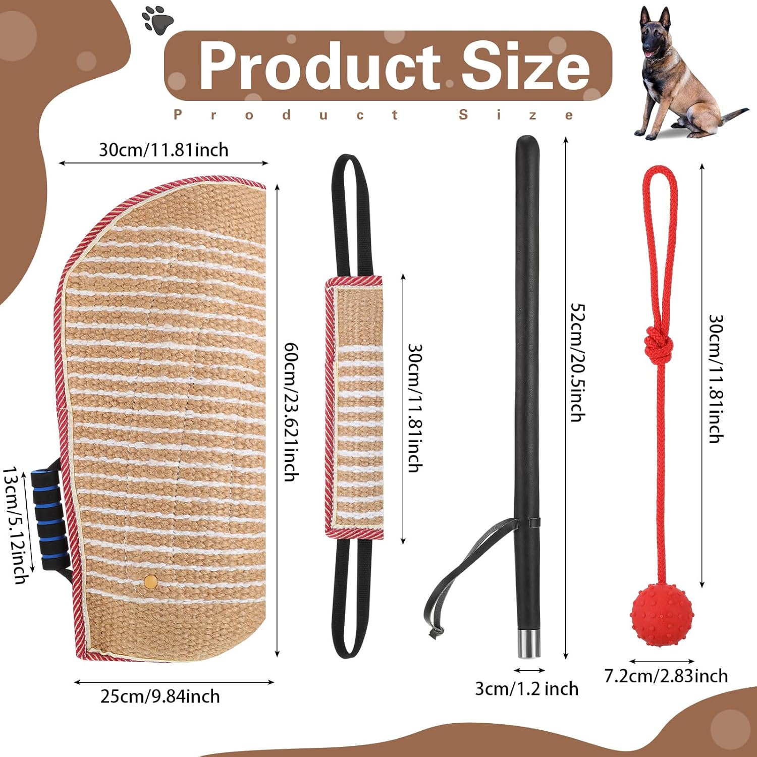 Proper Size: the dog chew sleeve is approx. 23.6 x 11.8 inches/ 60 x 30 cm, the dog chew tug toy is approx. 11.8 x 3.15 inches/ 30 x 8 cm, the dog training stick is approx. 20.5 x 1.2 inches/ 52 x 3 cm, and the dog chew rubber ball is approx. 2.8 inches/ 7.2 cm in diameter, chew sleeve is large enough for dogs to chew, and you don’t need to worry about an accidental dog chew, you can train dogs with this dog training equipment for tug of war, rope skipping, agility and more
