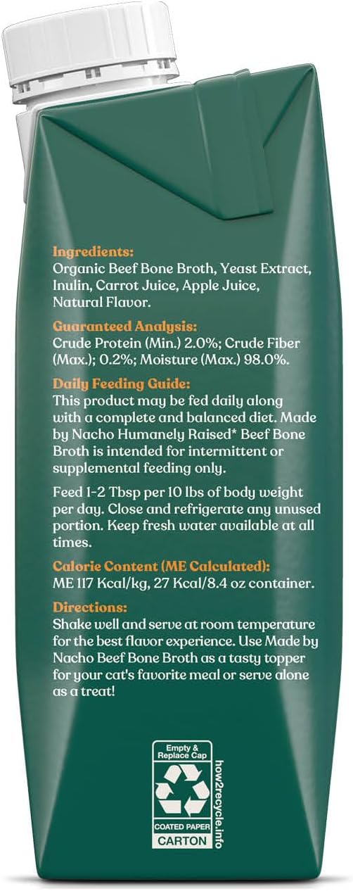 FORMULATED FOR ALL STAGES – Senior cat or baby kitty, this lickable bone broth for cats adds nutrition as well as hydration to each meal. Simmered for hours, Made by Nacho bone broth contains high quality proteins your cat needs at any age.