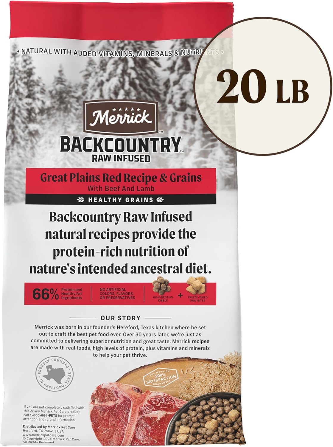 Merrick Backcountry Healthy Grains Freeze Dried Raw Pieces Plus Kibble For Dogs, Great Plains Red Meat Recipe. Natural With Added Vitamins And Minerals Dry Kibble With Beef And Lamb