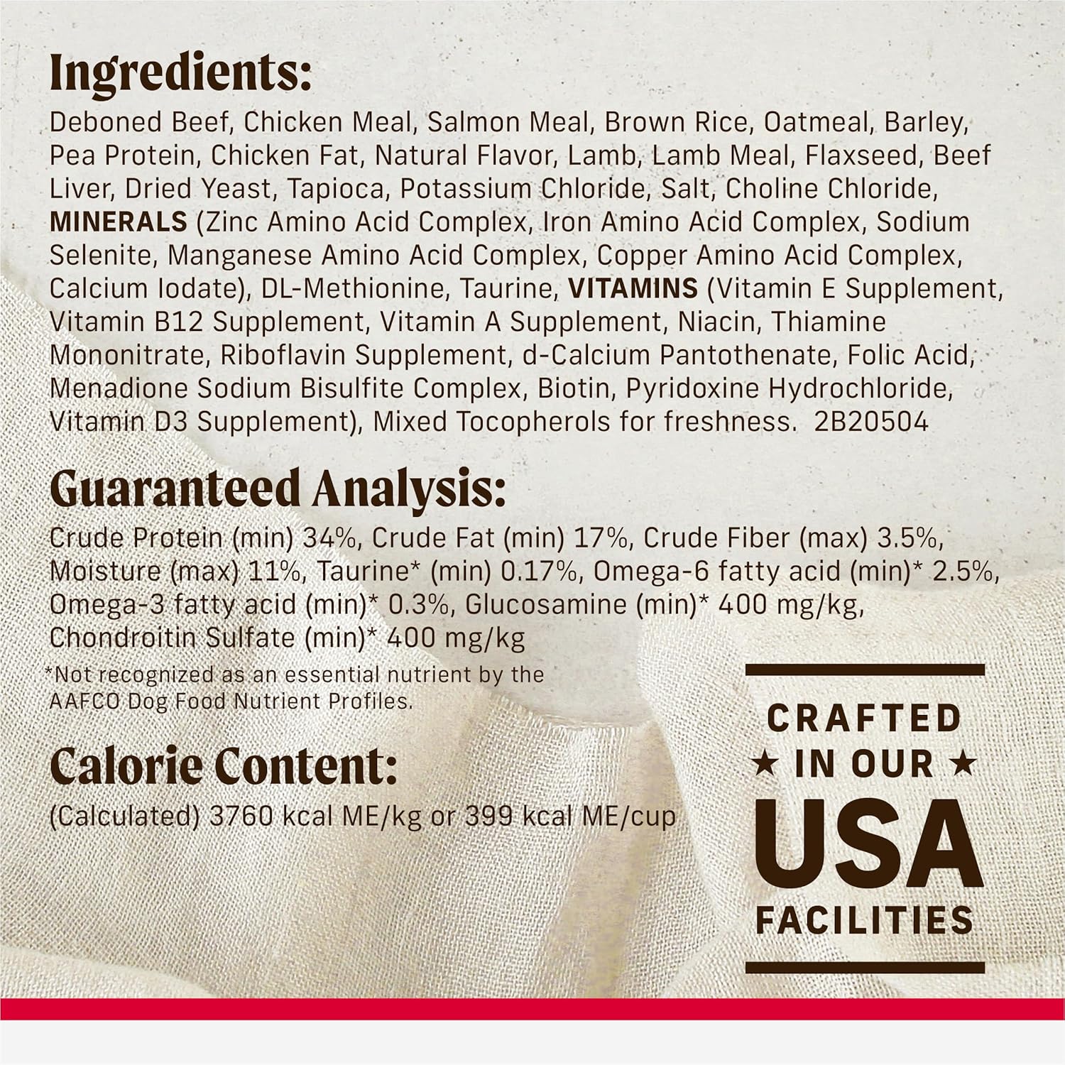 Premium dry dog food crafted with real beef and lamb provides high protein levels to help maintain lean muscle mass, plus whole grains to ensure balanced nutrition for adult dogs