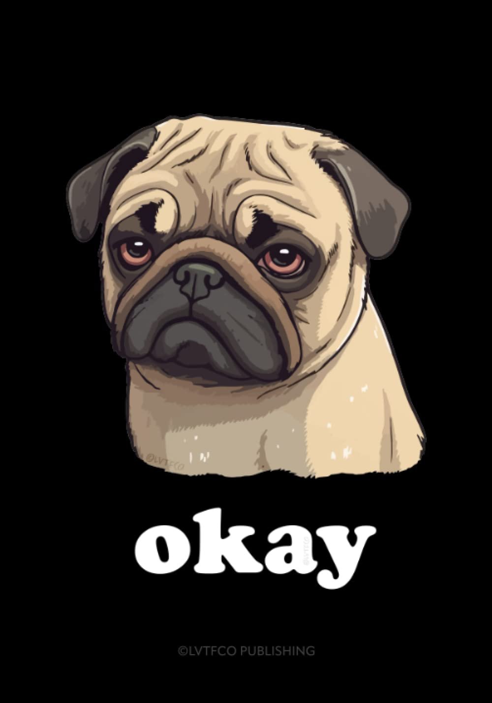 • Funny and cute illustrated art of an adorable pug’s face, and a humorous text that says “Okay”
