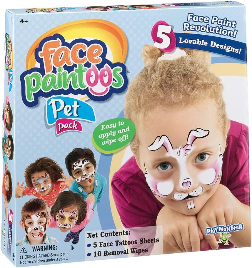 Face Paintoos are a face paint revolution–temporary face designs that make the magic of face painting a fun and easy activity for everyone! It’s easy to achieve perfect, long-lasting results every time, without the need for a professional face painter. Each fun design is non-toxic and hypo-allergenic, and is easily removed off using the included wipes. They’re great for parties, dressing up and role play! For ages 4 and up