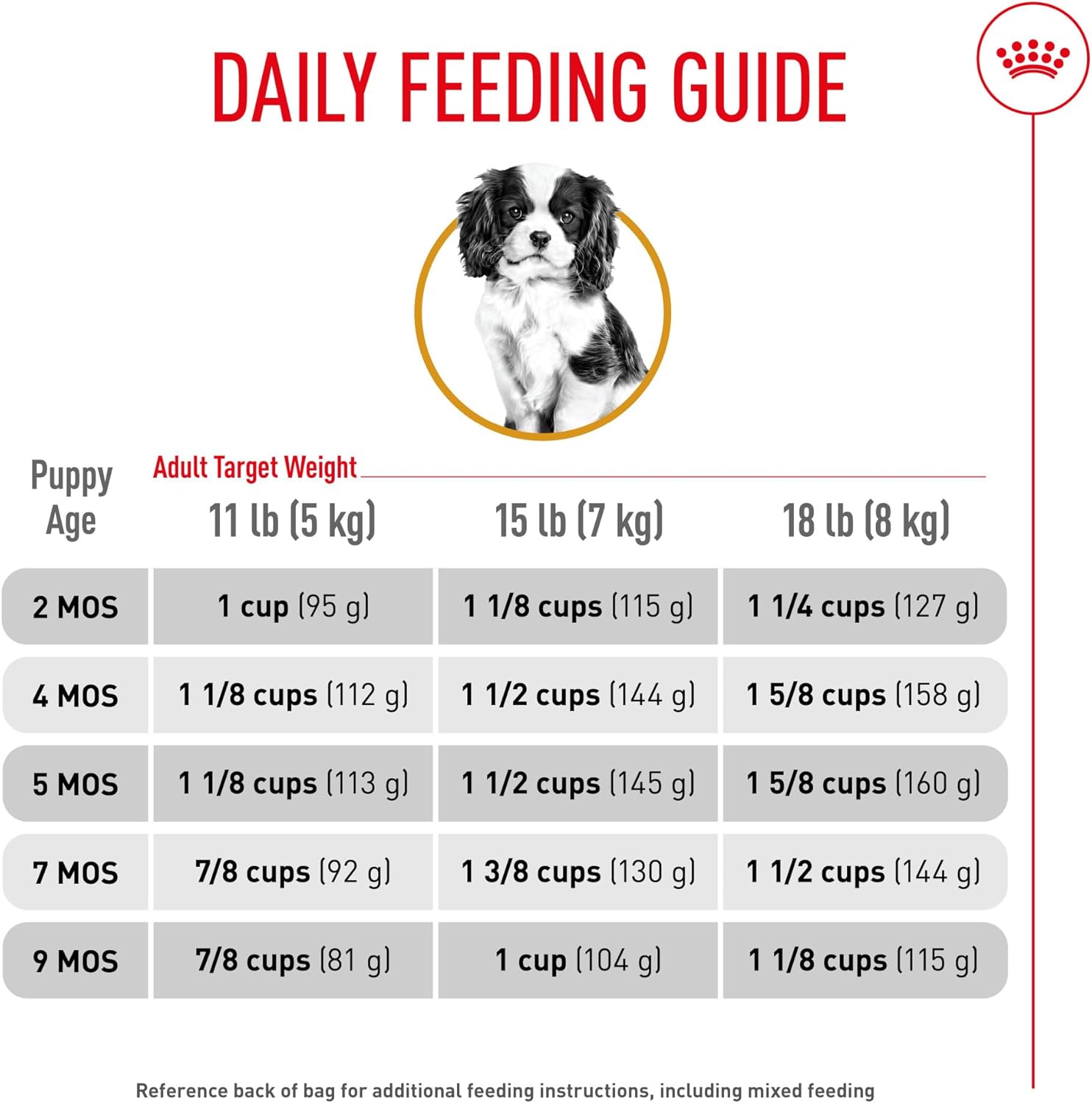 Royal Canin knows what makes your Cavalier King Charles Spaniel puppy magnificent is in the details. With their expressive eyes and feathered, wavy coat, Cavaliers are intelligent lapdogs fit for a king. These sweet puppies can benefit from the right growth formula for immune system support, healthy development, and digestive support during the puppy stage. Royal Canin Cavalier King Charles Puppy Dry Dog Food is tailor-made nutrition created just for your Cavalier pure breed puppy. Whether you have a Tricolor, Black & Tan, Ruby, or Blenheim Spaniel, this exclusive breed-specific diet is uniquely formulated for your small breed, with the specific nutrients to help puppies thrive. The specialized kibble is designed for your small dog’s tapered muzzle and scissor bite, making it easy for your young dog to pick up and chew. An exclusive mix of antioxidants and vitamin E supports their developing immune systems. Targeted nutrients like taurine, EPA and DHA from fish oil, and L-carnitine help maintain your tiny Cavalier’s cardiac function. And high-quality proteins and prebiotics promote healthy digestion and optimal stool quality. Once your Cavie is over 10 months old, transition them to Royal Canin Cavalier King Charles Adult Dog Food for precise nutrition into the adult years. With over 50 years of scientific research and observation, Royal Canin continues to deliver targeted nutrition to feed every pet’s magnificence. Not satisfied? Then neither are we. Our breed health formulas are 100% satisfaction guaranteed. (Just contact us for more details.)