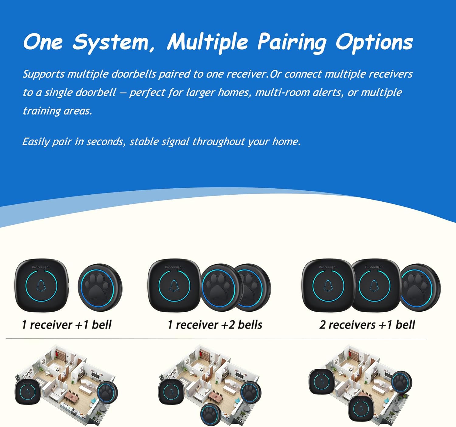 Long Wireless Range for Maximum Coverage: This dog door bell provides a 1000ft (300m) wireless range, ensuring you never miss your dog’s signal. Perfect for large homes or when you need coverage across multiple rooms