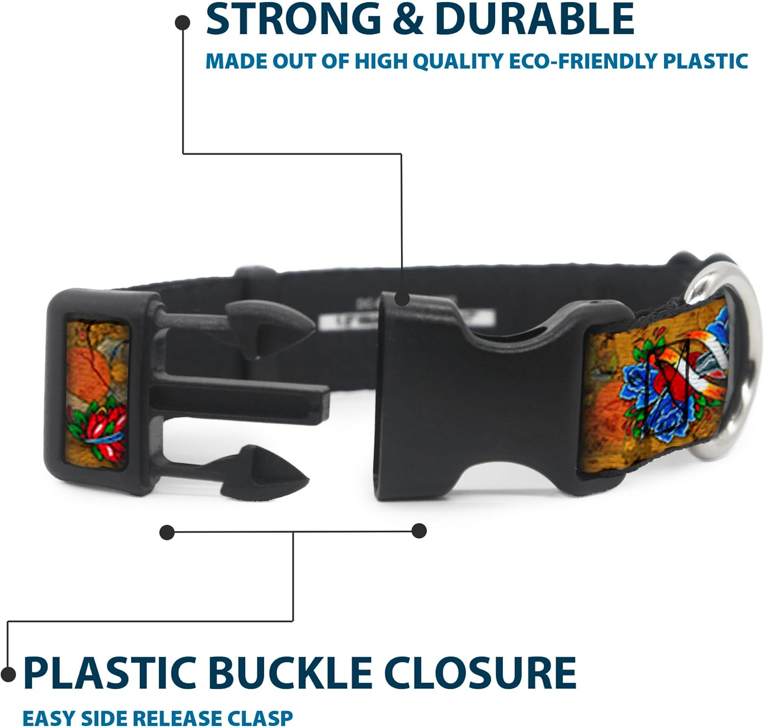 Vibrant and bold, this beautiful, polyester dog collar is made to show off your dog’s unique style through all the seasons. With an overengineered plastic buckle and strong D-ring, this durable collar can hold up to whatever your dog can dish out. This product is officially licensed by Tattoo Johnny.