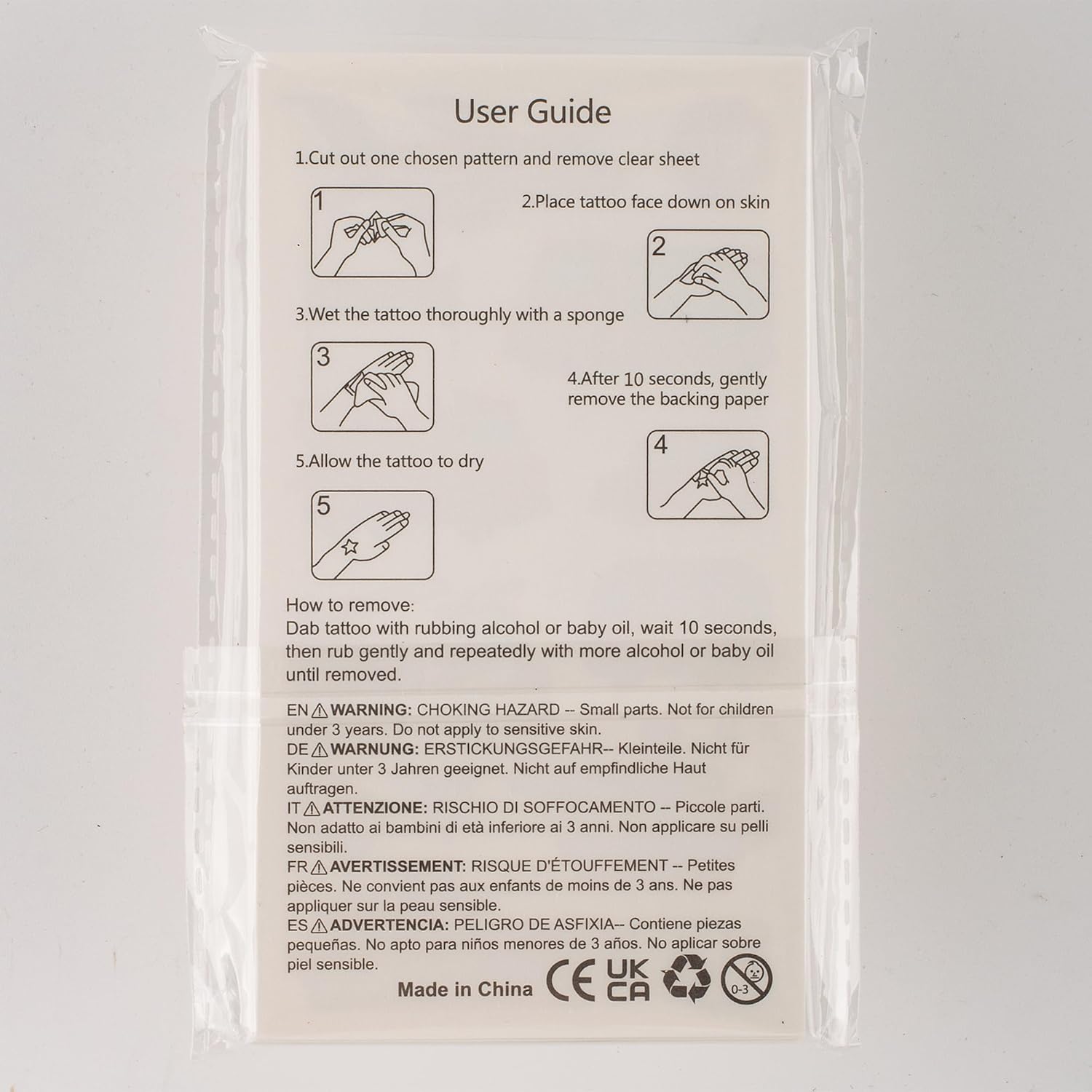 Instructions for use: 1.Cut out the design what you want and tear the transparent protector. 2. Paste the patterned side onto the skin. 3.Tap the tattoos sticker with a damp cloth or sponge until it is completely wet. 4.After 10 seconds,gently remove the backing paper. 5.Allow the temporary tattoos to dry.