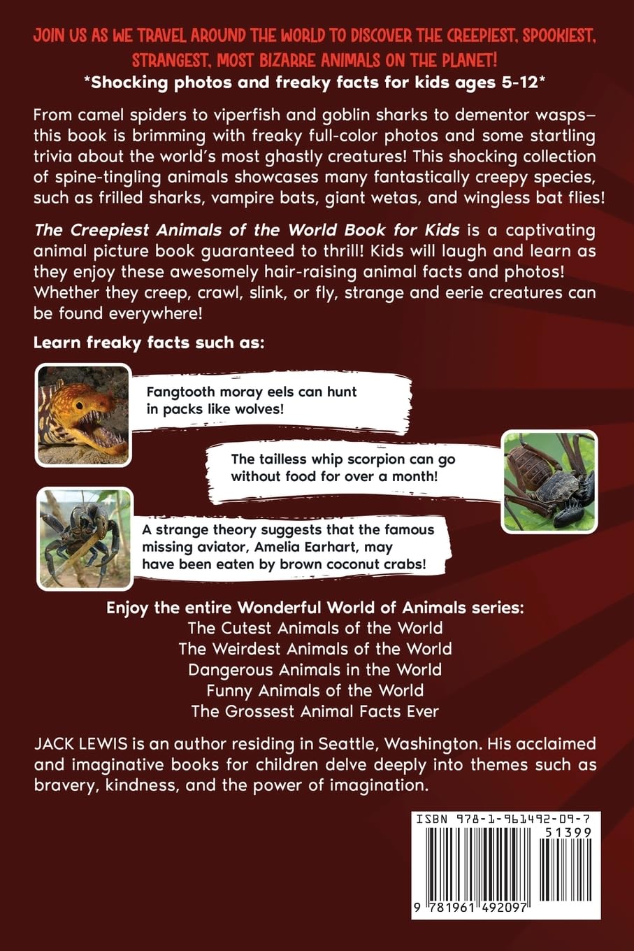 The Creepiest Animals of the World Book for Kidsis a captivating animal picture book guaranteed to thrill! Kids will laugh and learn as they enjoy these awesomely hair-raising animal facts and photos! Whether they creep, crawl, slink, or fly, strange and eerie creatures can be found everywhere!
