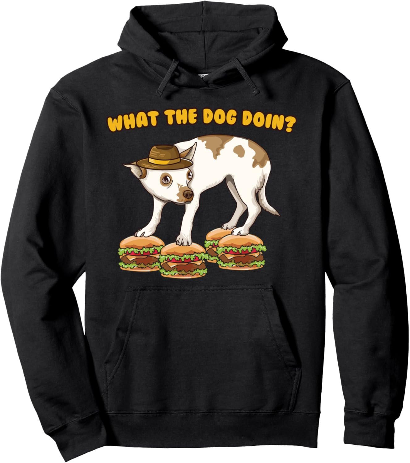 Features a cute chihuahua dog standing on hamburgers. This funny meme is perfect for people that love dogs and ironic memes. A dog wearing a small cowboy hat and looking quite nervous. Gift idea for people that like cowboys and animals in cowboy hats. Men and women who are into memes and adorable animals. Dog lovers gifts. Chihuahua dog owners. What the dog doing meme.